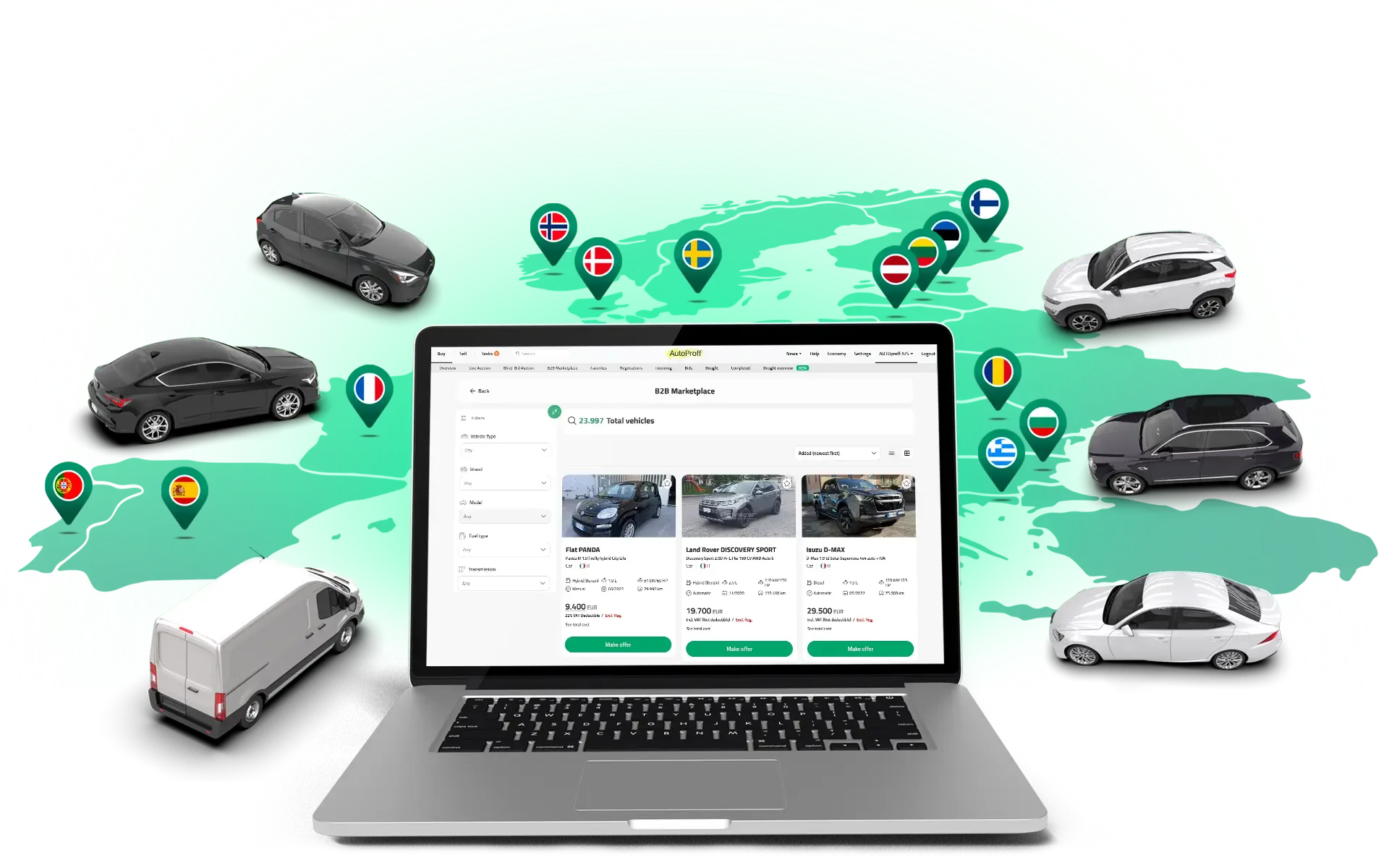 Wenn das richtige Fahrzeug B2B nicht verfügbar ist, steht es vermutlich auf dem Hof eines Händlers irgendwo in Europa. Der AutoProff B2B Marketplace hilft Ihnen es mit weniger Verwaltungsaufwand zu finden, zu kaufen und liefern zu lassen.